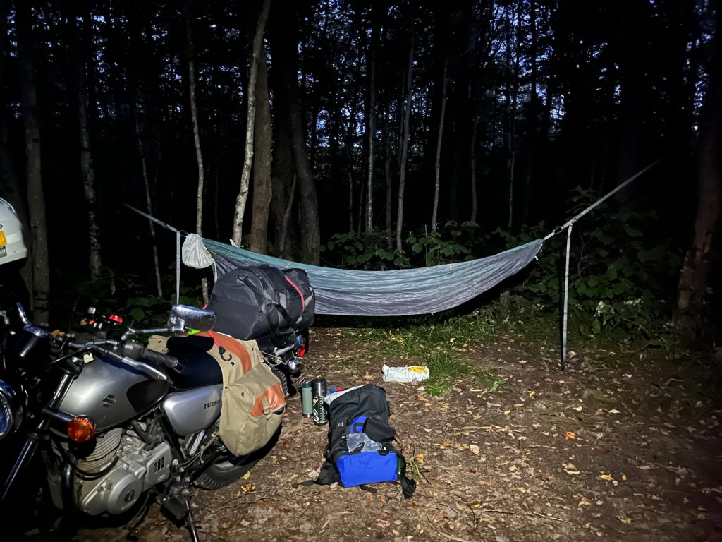 Not wanting to undo half of my day’s hard-won progress, I opted instead to head 45 minutes back west towards Bridgewater and into the Coolidge State forest, where dispersed camping was permitted. I turned onto a dark, dirt road and headed into the forest before parking my bike, making a fire in my stove and hanging up my hammock. It was 9 pm and I was done. I had decided I would not make any big decisions about the future of this journey that night. I knew I was frazzled and exhausted. Any decisions could wait until the morning after a good night’s sleep. The fire was my companion for a few hours and keeping it fed gave me something to focus on instead of ruminating. I also was treated to a pair of eyes staring at me from a distance, reflecting the light from my head torch. When I looked across the dirt path, I could see the dew drops in the grass reflecting the light, like a thousand twinkly stars. Upon closer investigation, they were not dew drops, but thousands of spider eyes, eight to a spider.6 So there I was, all by myself in a dark forest, with only the mystery eyes and spiders to keep me company. Before too long, I let the fire burn out and turned in for the night. The only redeeming factor of that night was that I was so exhausted that I slept like a rock.